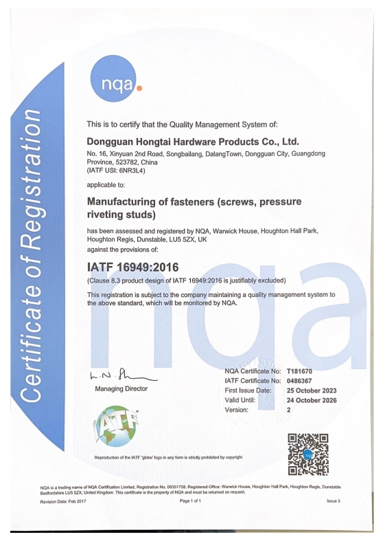 東莞市紅泰五金制品有限公司,公司占地六千多平方米,擁有五十多組螺絲機及六十臺自動車床設備。是一家專業設計、生產ISO、DIN、GB、JIS、ANSI、BS及客戶指定特殊要求的高精密五金緊固件的制造企業。